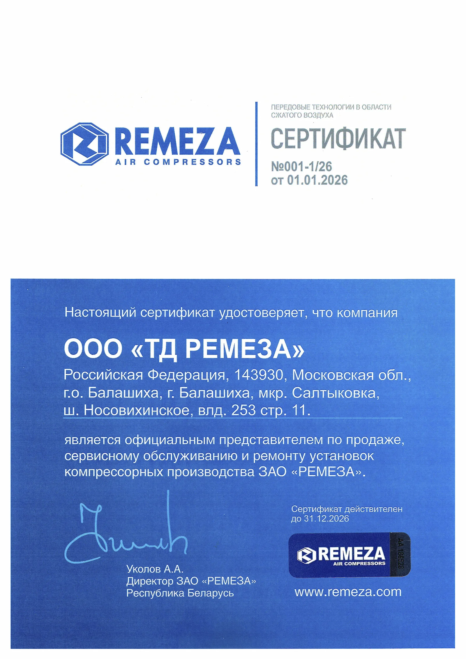 Компрессоры REMEZA имеют все обязательные сертификаты и регистрационные удостоверения для распространения на территории РФ