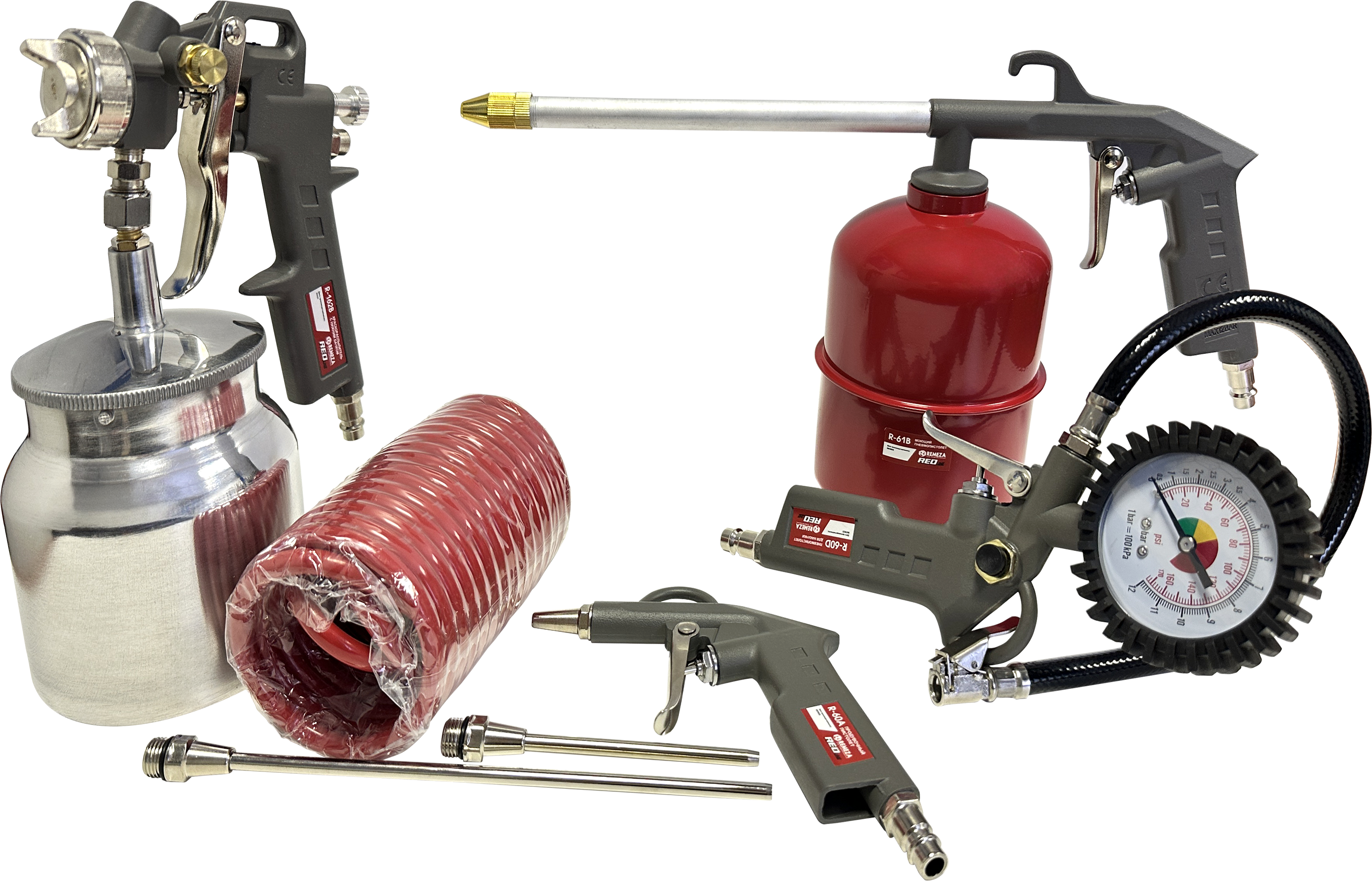 Все инструменты в наборах имеют быстросъёмное подключение, благодаря чему к спиральному шлангу можно быстро подключить любой инструмент и приступить к выполнению рабочей операции.